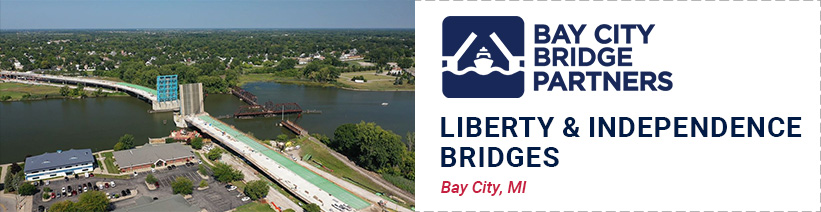 A short distance upriver from Liberty Bridge on the Saginaw River stands the Independence Bridge, which is currently going through the permitting and design development phase. Work is scheduled to begin early 2023 with a targeted 2024 completion. For the latest project news and more information, visit https://baycitybridgepartners.com/.